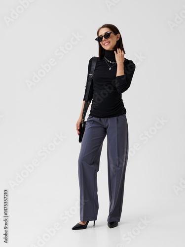 © Streetstylephoto, Fototapeta premium Pregnant girl model in stylish clothes on white background in studio.