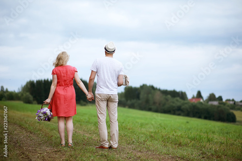 © alexkich, Fototapeta premium Pregnant girl with big belly and young man outdoor