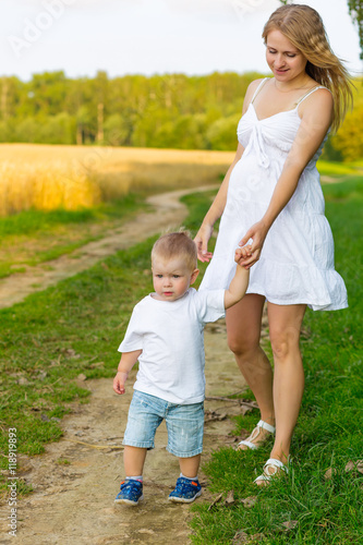 © Nadya Kolobova, Fototapeta premium Pregnant mom with a boy resting in a meadow.