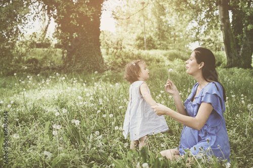 © liderina, Fototapeta premium Pregnant mother playing with little daughter in park. Mother and daughter blowing dandelion.
