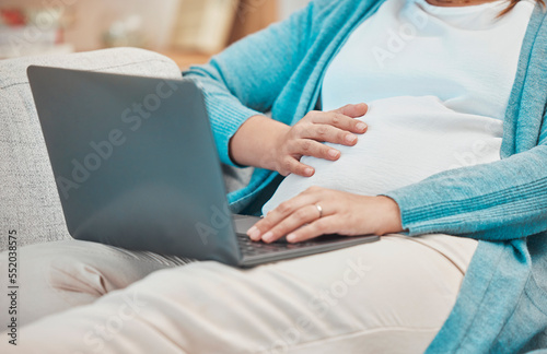 Naklejka premium Pregnant, woman and laptop for online medical research to prepare for...