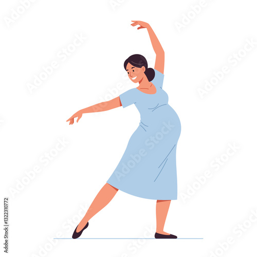 Obraz premium Pregnant woman dancing joyfully in a blue dress, flat vector art illustration