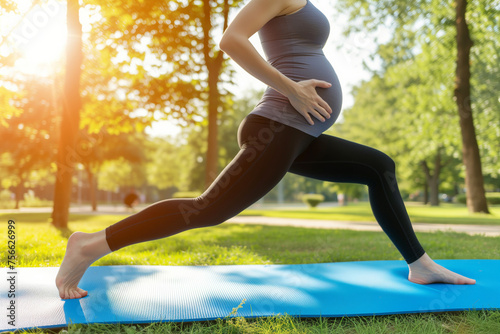 © Виктория Марьенко, Fototapeta premium Pregnant woman exercising in the park in preparation for motherhood