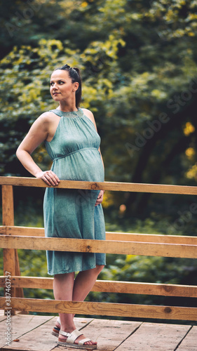 © Duche, Naklejka premium Pregnant woman in a dress walking through the forest. Portrait of a young, pregnant woman.