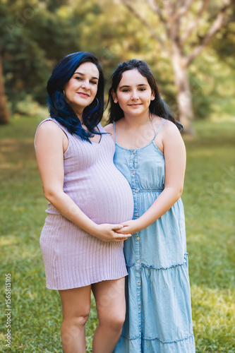 © Fernanda Flugel, Fototapeta premium pregnant woman in dress with eldest daughter outdoors.