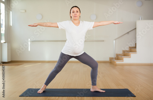 © caftor, Naklejka premium Pregnant woman is engaged in yoga. Warrior Pose or Virabhadrasana
