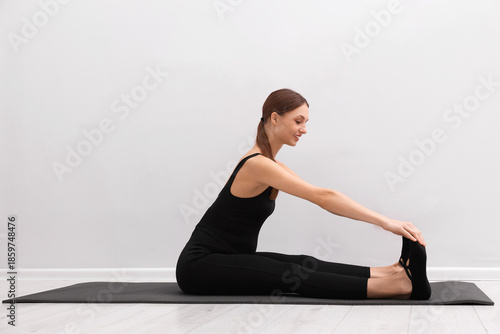 Fototapeta premium Pregnant woman practicing yoga on mat indoors