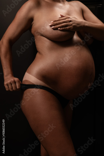 © Михаил Решетников, Naklejka premium Pregnant woman pulls back her panties showing instant tan. Vertical photo.