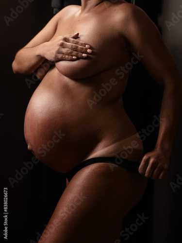 Fototapeta premium Pregnant woman pulls back her panties showing instant tan. Vertical photo.