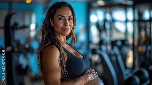 © kwangze, Fototapeta premium Pregnant woman smiling in gym, showcasing fitness and health during pregnancy.