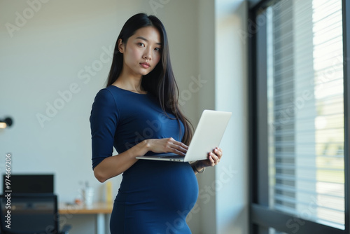 © Flash, Fototapeta premium pregnant woman standing and working a her office, generative AI