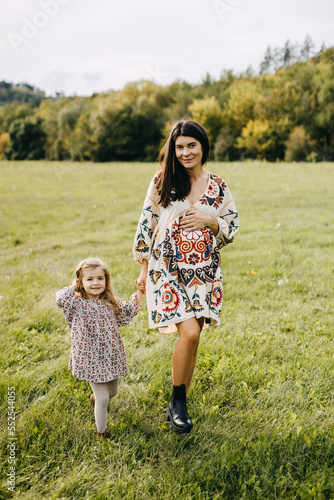 Obraz premium Pregnant woman walking with her toddler daughter in an open field, spending...