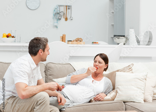 Fototapeta premium Pregnant woman with her husband eating strawberry