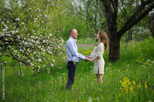 Fototapeta premium pregnant woman with husband in blooming garden