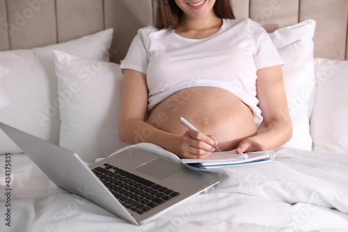 Fototapeta premium Pregnant woman working on bed at home, closeup. Maternity leave