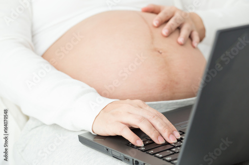 Naklejka premium Pregnant women working at home which online to head office by internet network and vpn to office with black laptop put on her leg