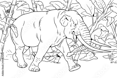 Fototapeta premium Prehistoric animals. Illustration with extinct Elephant - Mastodon. Silhouette drawing for coloring book.