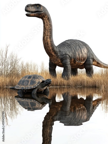 © DZIKRA , Obraz premium Prehistoric reptile and turtle by calm water; nature scene
