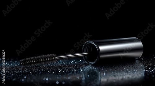 © Auraclicks, Fototapeta premium Premium mascara tube curved brush on reflective black surface glowing light highlight professional cosmetic packaging detail