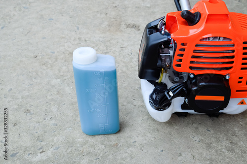 © FOlga, Obraz premium Prepared fuel mixture for a two-stroke gasoline trimmer engine. Gasoline trimmer.