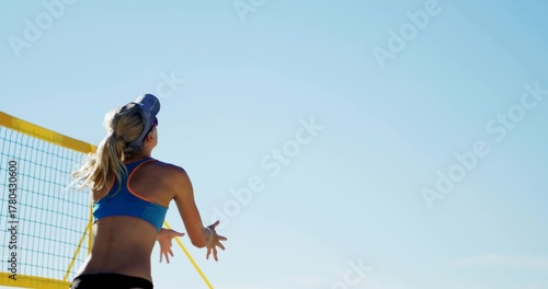 © vectorfusionart, Obraz premium Preparing beach volleyball player raising arms near yellow net, wearing blue sports bra, copy space
