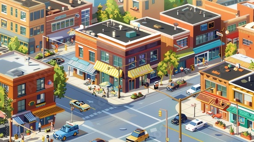Naklejka premium Present an aerial view of a multicultural neighborhood, with diverse shops and restaurants bustling along the busy street.
