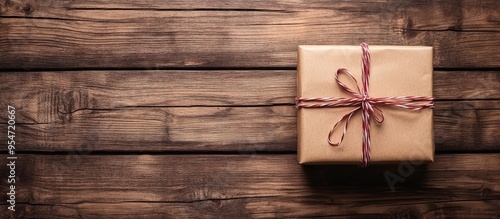 Fototapeta premium Present box gift decoration on wooden table top view with copy space