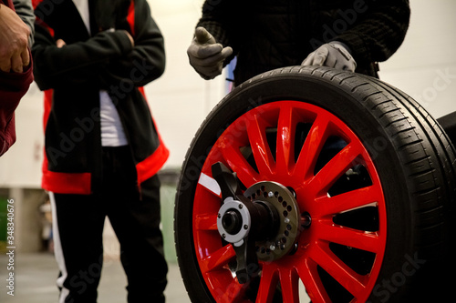 © Agnieszka Komuńska, Obraz premium Presentation of a new car wheel at the car workshop