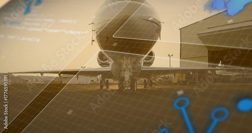 © vectorfusionart, Fototapeta premium Presenting commercial jet sitting head-on on tarmac at golden hour, with hangar, map interface