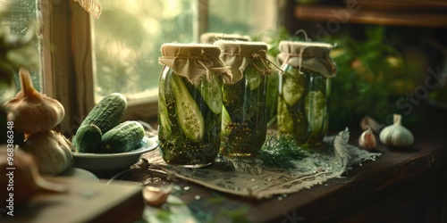 © AkuAku, Fototapeta premium Preserved cucumbers with a touch of salt dill and garlic for winter storage