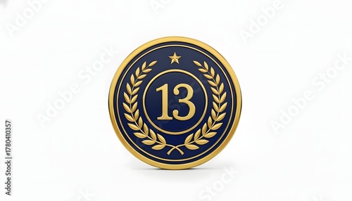 © Agus Through Lens, Naklejka premium Prestigious 3D gold and navy blue medallion displaying the number thirteen within a laurel wreath, perfect for signifying a particular rank or recognition in a competition