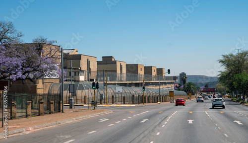 Fototapeta premium Pretoria Central Prison, South Africa.Traffic at Kgosi Mampuru street and blooming jacaranda trees