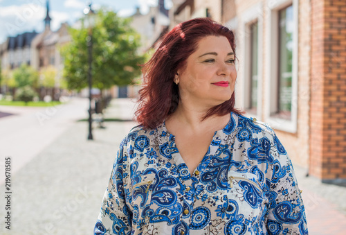 Fototapeta premium Pretty american middle age woman in vacation or at city. Size plus and xxl...
