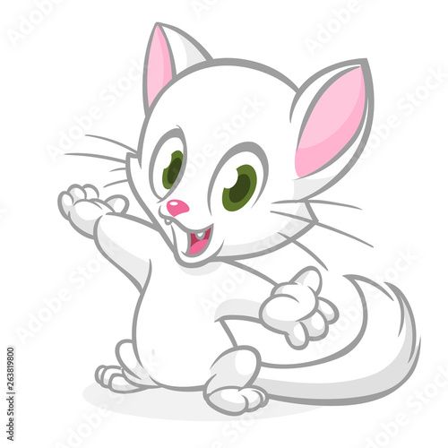 © drawkman, Naklejka premium Pretty and cute white cat cartoon with fluffy tail waving. Vector illustration