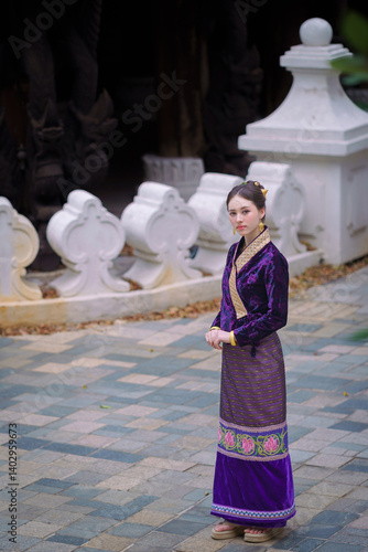 Fototapeta premium Pretty Asian women in traditional Thai dress. Beautiful conventional Thai dresses Lanna style. Fashion Thai dresses are popular with travellers in Chiang Mai, Thailand.