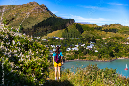 © Jakub, Naklejka premium pretty backpacker girl enjoys the coastal walk between pony point and lyttelton near christchurch, canterbury, new zealand south island; hiking on the coast with the view of banks peninsula