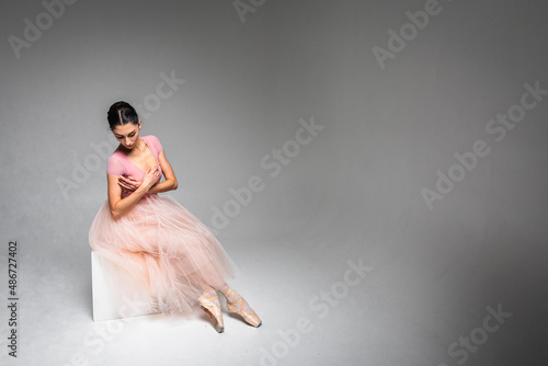Naklejka premium pretty ballerina. A young elegant ballet dancer, dressed in professional attire, shoes and a pink weightless skirt with a tulle, demonstrates her dancing skills, sitting. The beauty of classical balle