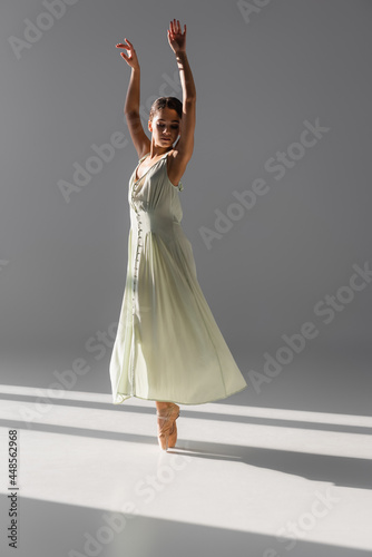 Fototapeta premium Pretty ballerina in dress spinning on grey background with sunlight