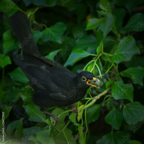 © Kanea, Obraz premium pretty blackbird collects berries in a green hedge