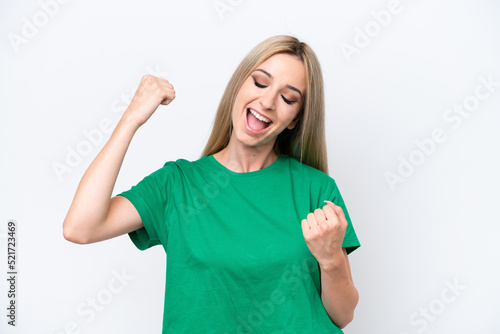 Fototapeta premium Pretty blonde woman isolated on white background celebrating a victory
