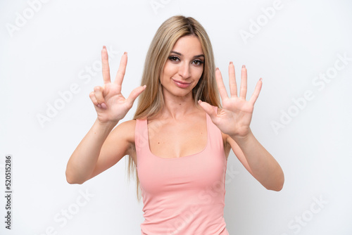 Fototapeta premium Pretty blonde woman isolated on white background counting eight with fingers