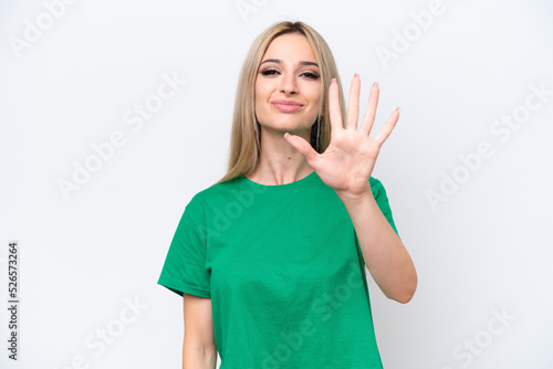Fototapeta premium Pretty blonde woman isolated on white background counting five with fingers