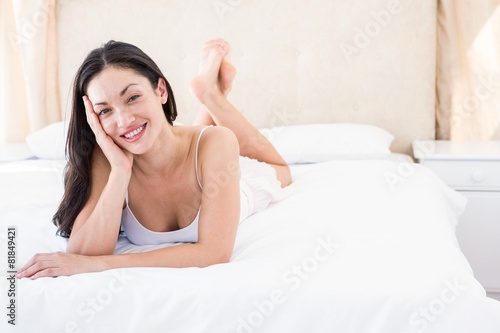© WavebreakmediaMicro, Fototapeta premium Pretty brunette smiling on bed