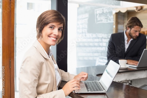 Obraz premium Pretty businesswoman working on her break on laptop