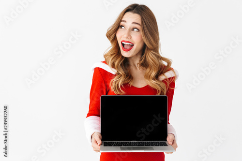 © Drobot Dean, Fototapeta premium Pretty excited woman in christmas costume showing display of laptop computer.