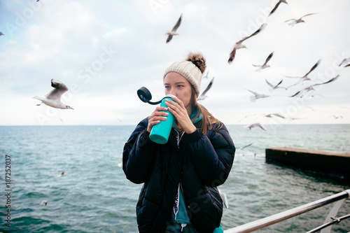 Obraz premium Pretty girl drinking tea from thermos near the sea.