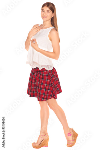 Naklejka premium Pretty girl in a vest and skirt behind white wall