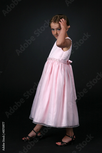 © sparkmom, Naklejka premium pretty girl in pink dress, touching her hair