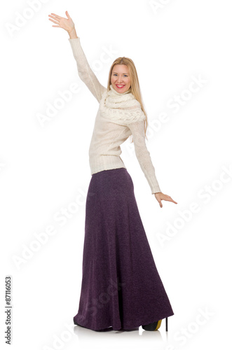 Naklejka premium Pretty girl in violet long dress isolated on white