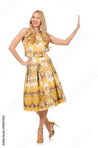 Fototapeta premium Pretty girl in yellow floral dress isolated on white